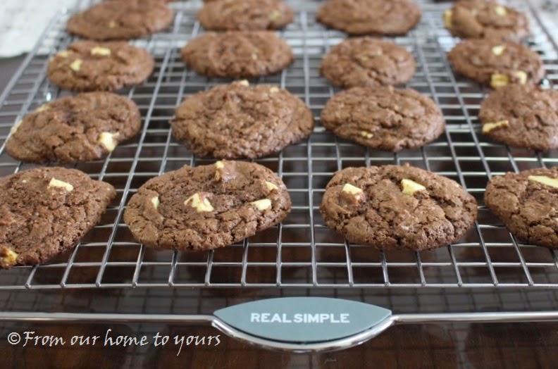 3) Asse por 9 a 11 minutos, ou até que as bordas estejam definidas e começando a dourar. Retire do forno, deixe esfriar 1 minutinho apenas e transfira os cookies com o auxílio de uma espátula para uma grade ou outra forma coberta com papel toalha.